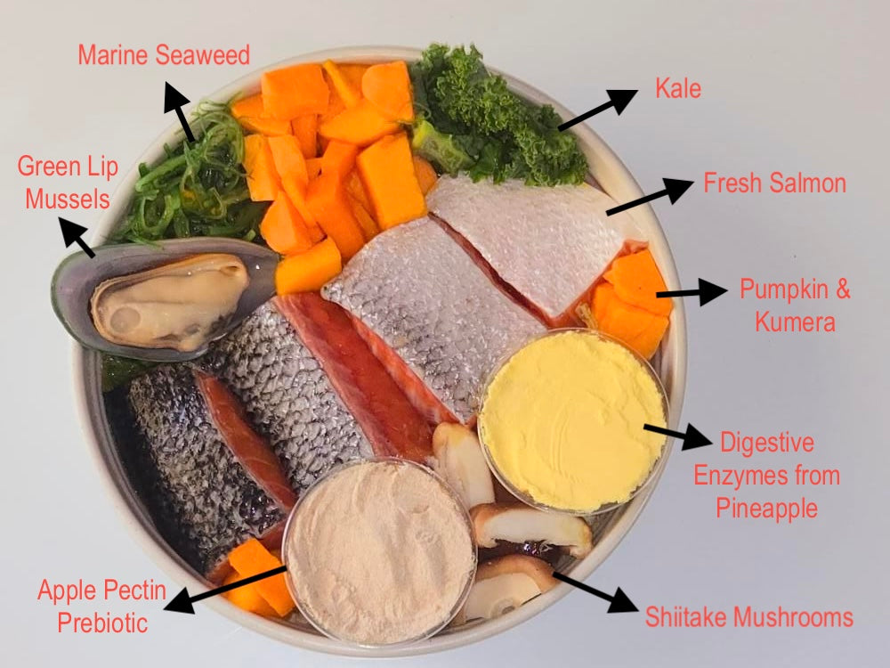 Fresh Salmon, Kumera, Butternut Pumpkin, Green Lip Mussels, Shiitake Mushrooms, Kale, Brazil Nuts, LSA Seed & Nut Oils, Chlorella, Seaweed, Apple Pectin, Bromelain Enzyme Mixture from Pineapple, DHA & EPA Essential Omega 3 Fatty Acids, Blueberries, Raspberries, Blackberries, Vet Nutritionist Clinic Vitamins, Minerals, Trace Elements, Taurine and Carnitine.